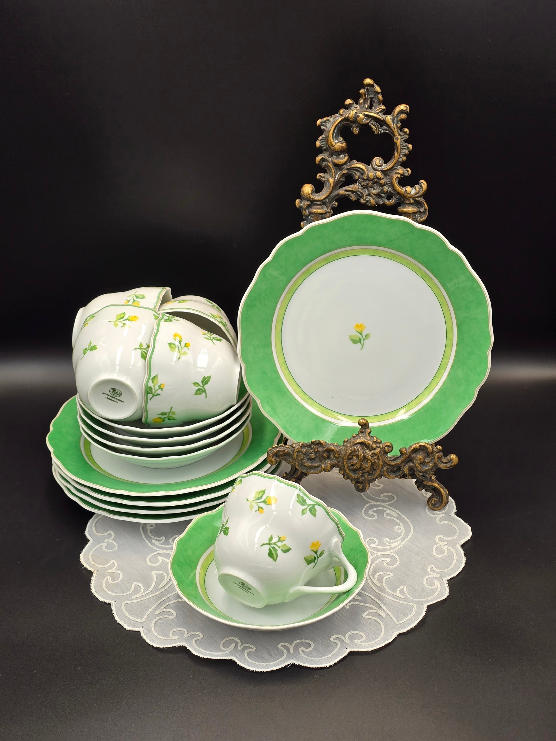Vasariški Hutschenreuther porceliano fabriko trio, padabinti geltonomis rožėmis. Polėkštė ir deserto - užkandžių lėkštė turi platų šviesiai žalią apvadą. Kraštai puodelio ir lėkščių gražiai pabanguoti. Polėkštė pagilinta ir primena dubenėlį. Būklė puiki.