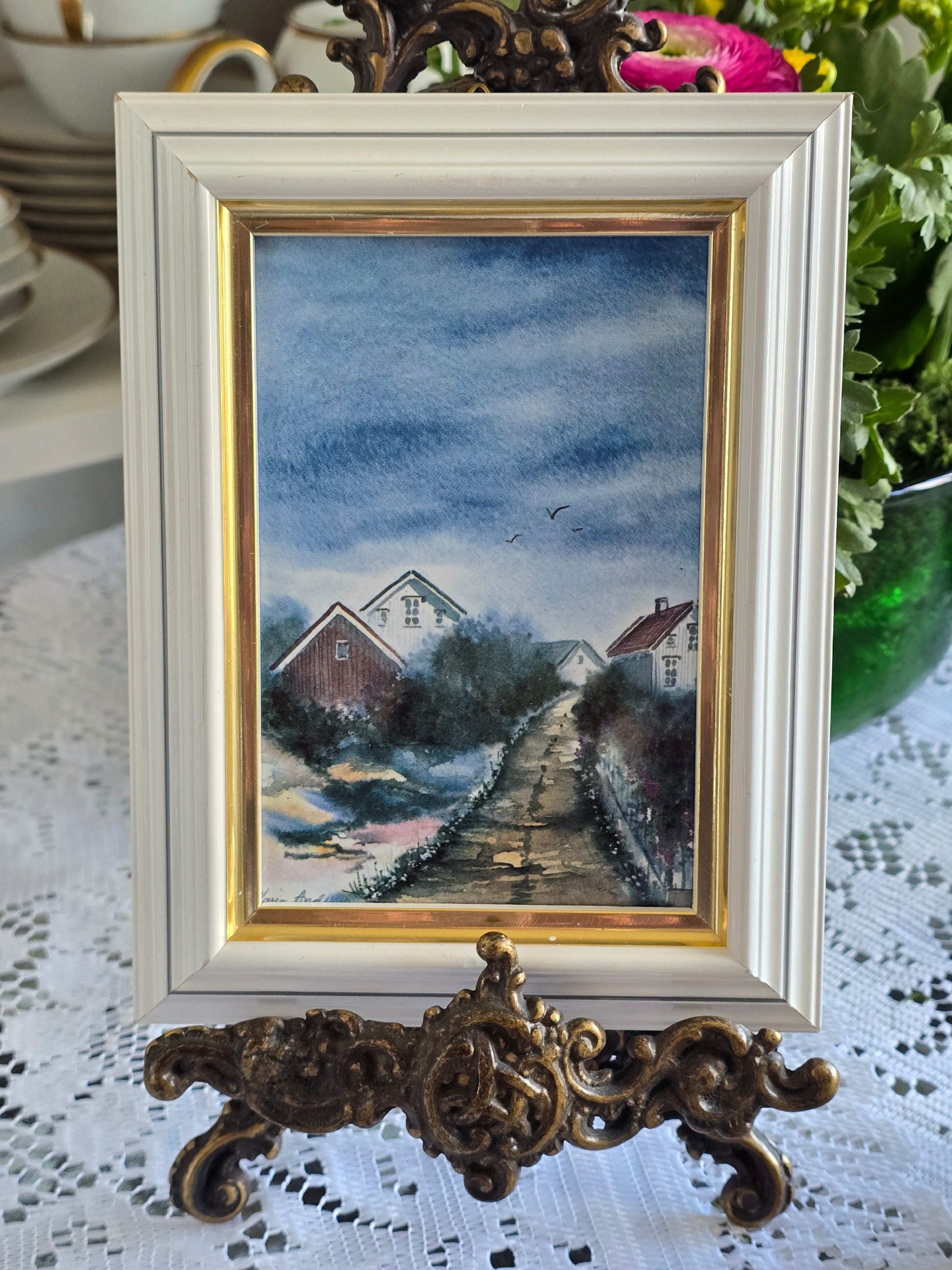 Vintažinė Karin Andersen paveikslo reprodukcija ant plytelės, įrėminta baltu su auksinės spalvos krašteliu mediniu rėmeliu. Reprodukcijoje pavaizduotas skandinaviškas peizažas. Akvarelės technika nupieštas paveikslėlis datuojamas apie 1987 m. Kabinamas.