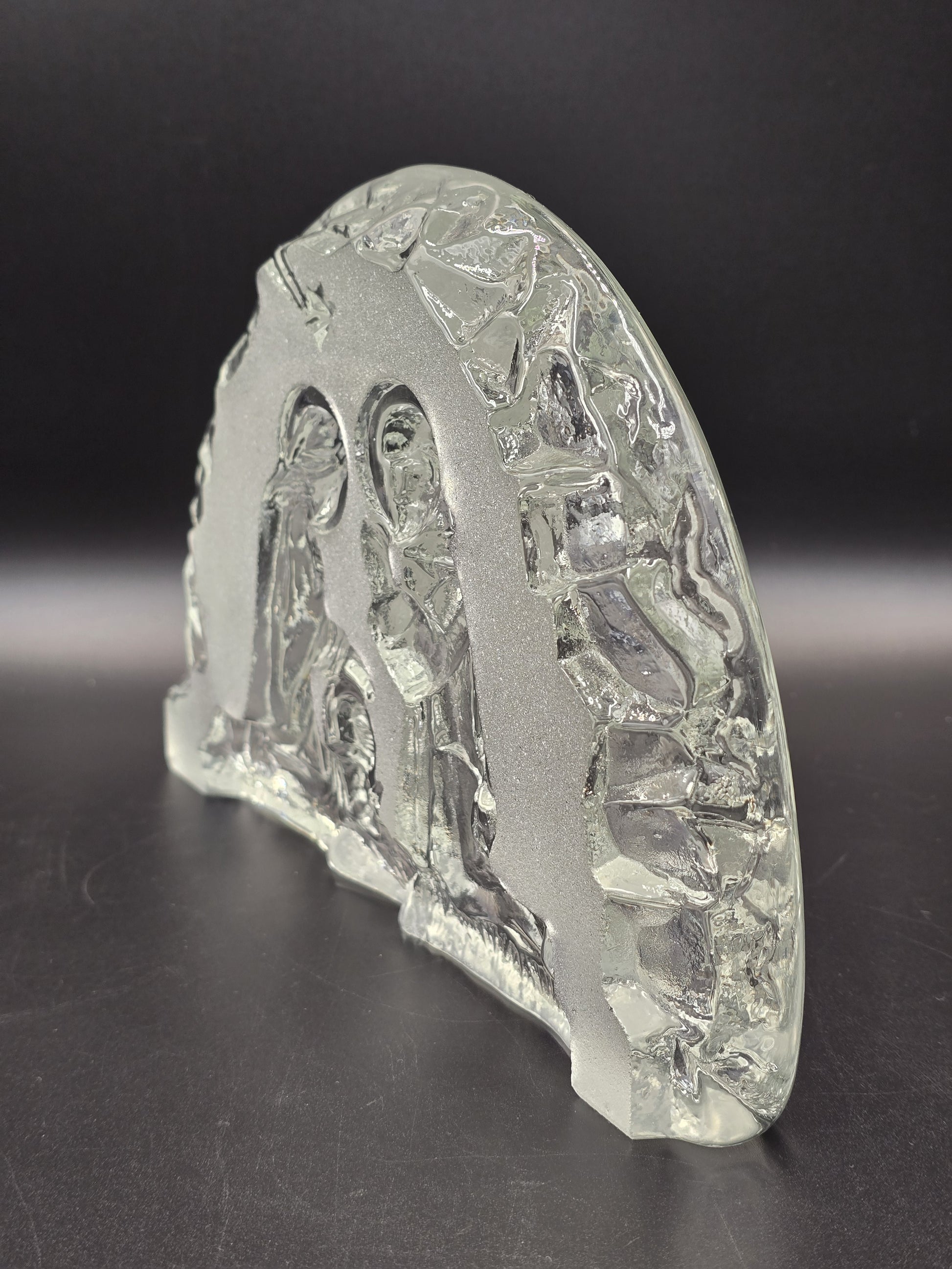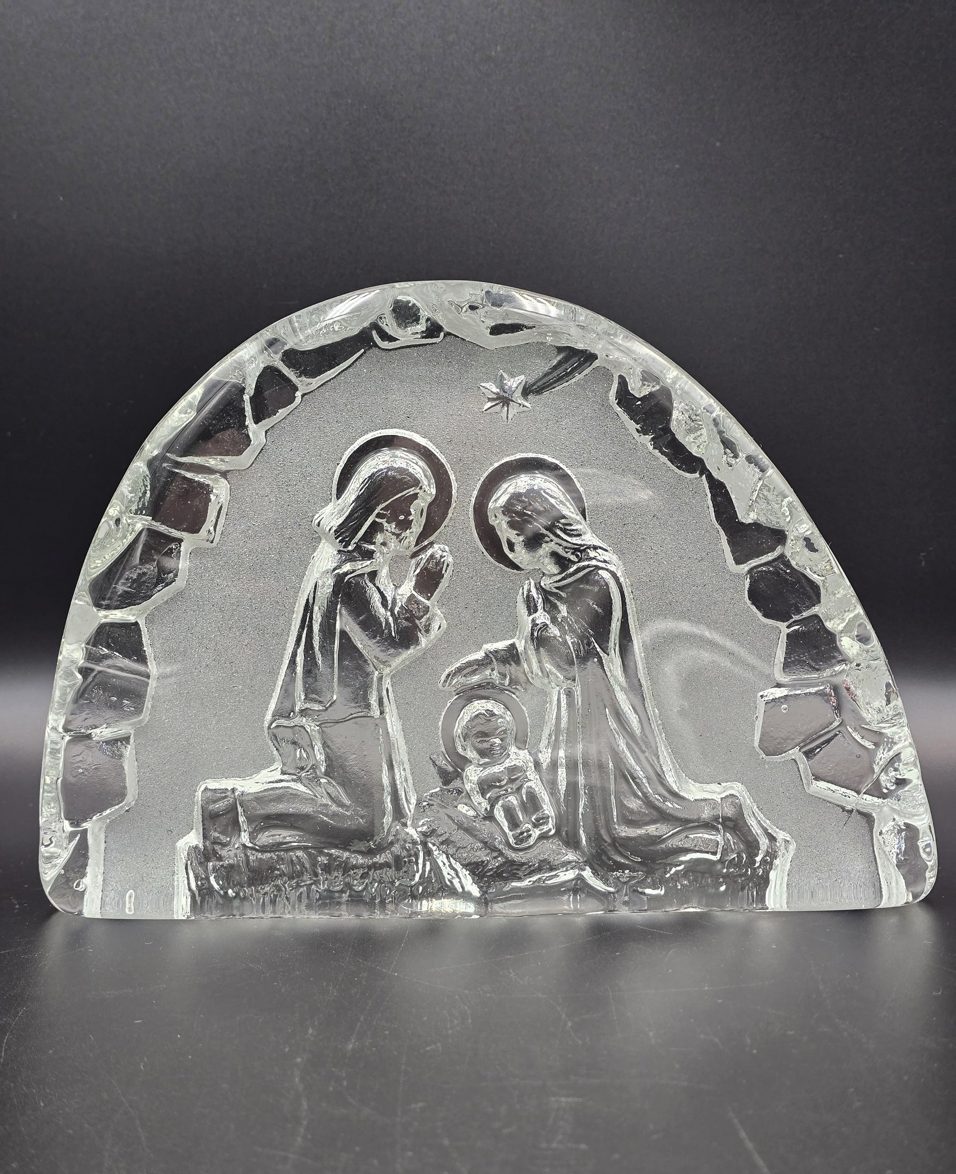 Pastatoma stiklo prakartėlė, sunki,stabili. Už jos pastačius žvakutę, puikiai apsišviečia ir išryškėja pavaizduotos figūros. Kalėdų laikotarpio dekoras kiekvieniems namams. Būklė puiki.