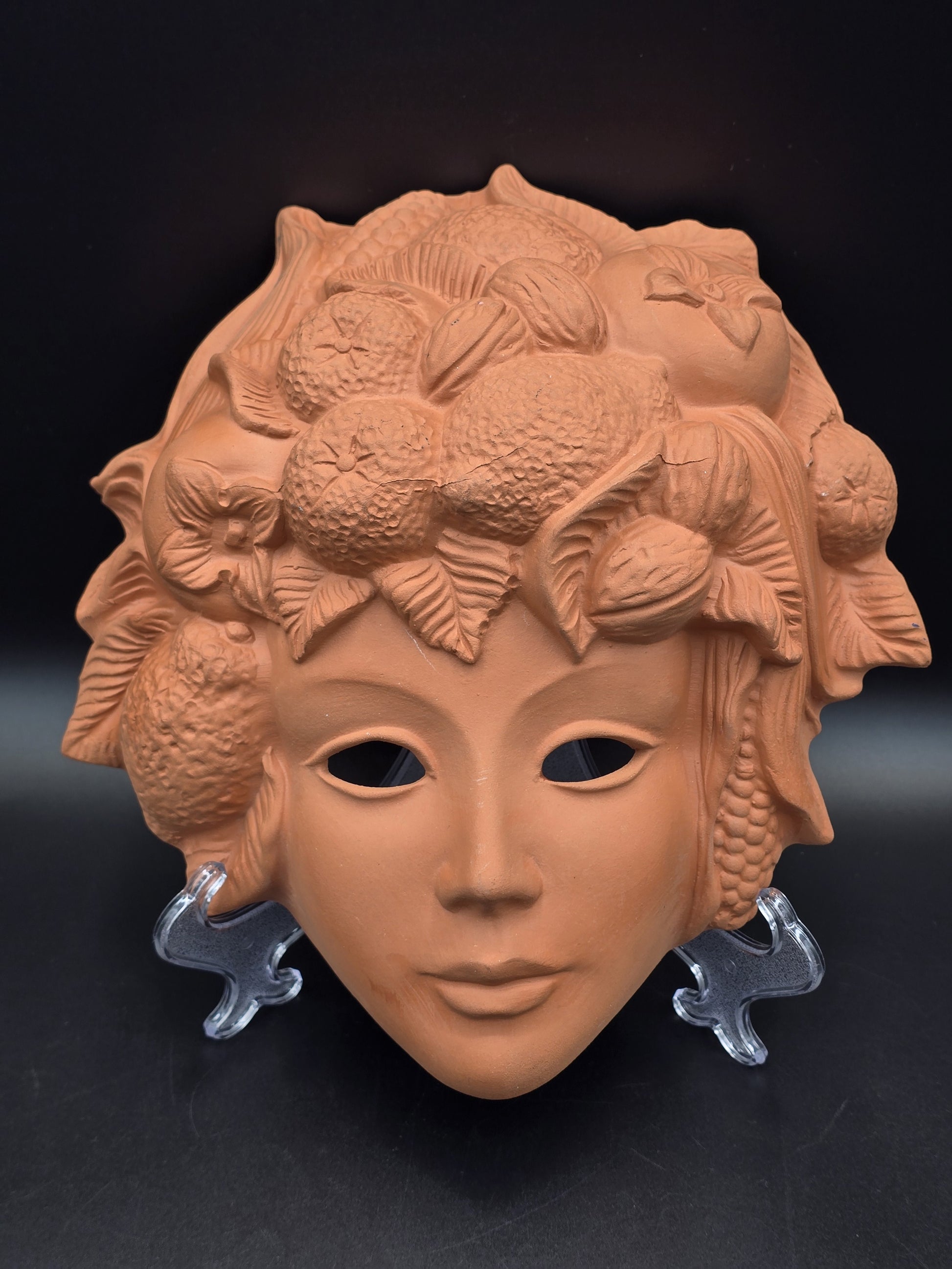 Terakotinė kaukė, kabinama ant sienos, skirta interjero papuošimui. Ant galvos, vietoj plaukų, pavaizduoti vaisiai ir daržovės.