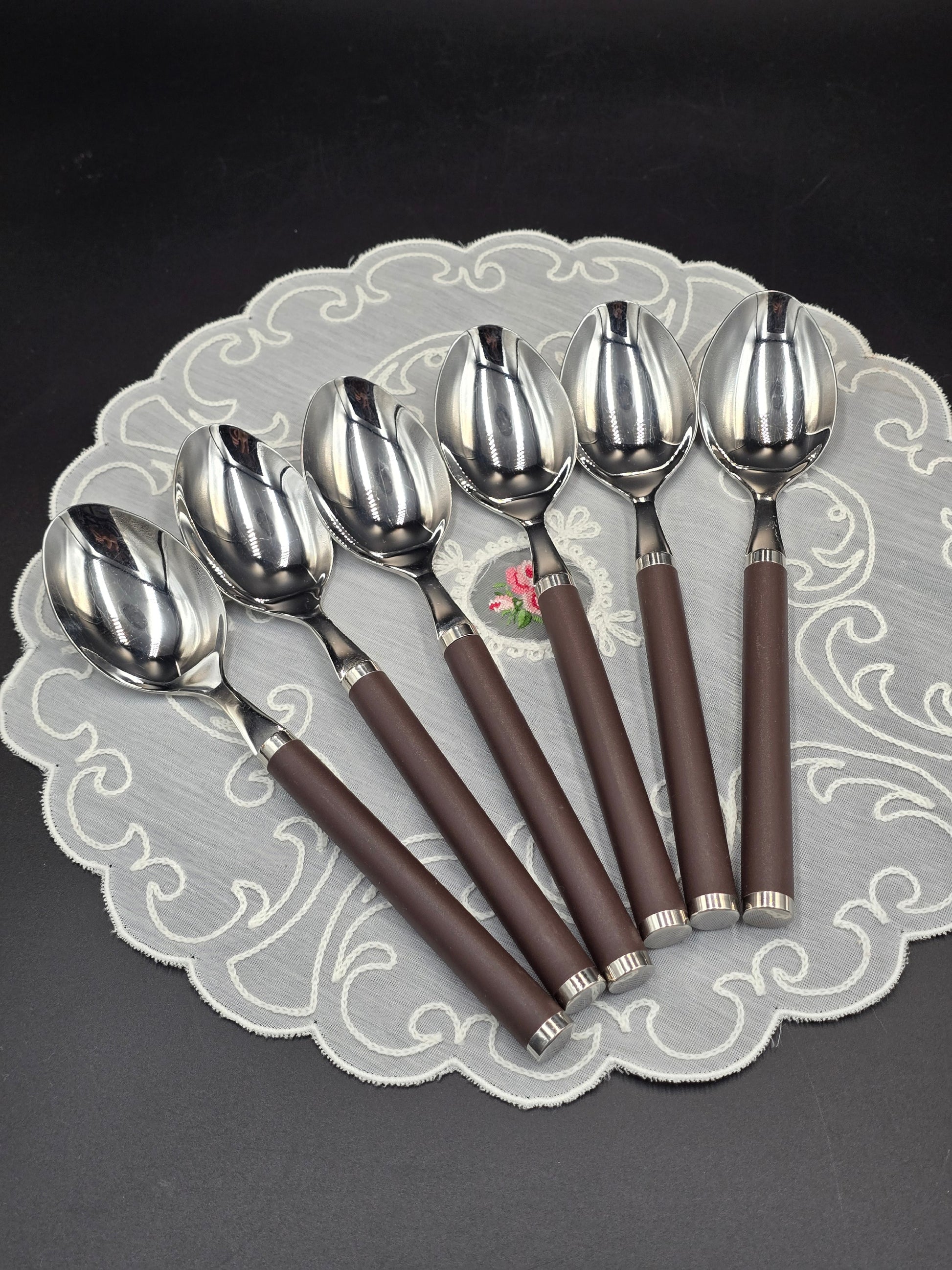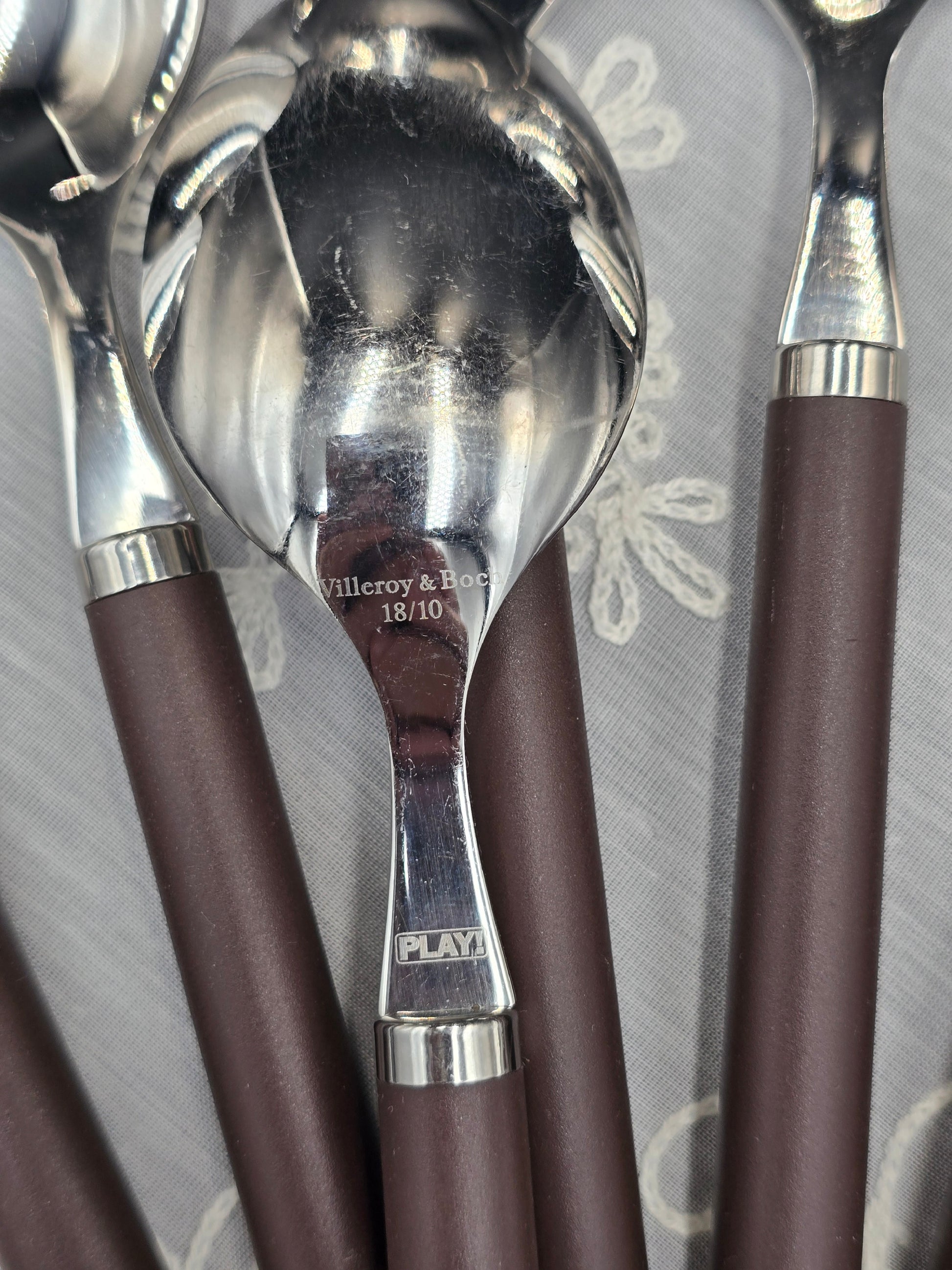 Villeroy & Boch kolekcijos ,, Play! Chocolate Brown '' šaukštai. Pagaminta iš poliruoto 18 / 10 nerūdijančio plieno su šokolado spalvos plastiko rankena. Rinkinys iš 6 vnt. Įrankiai tinkami plauti indaplovėje.