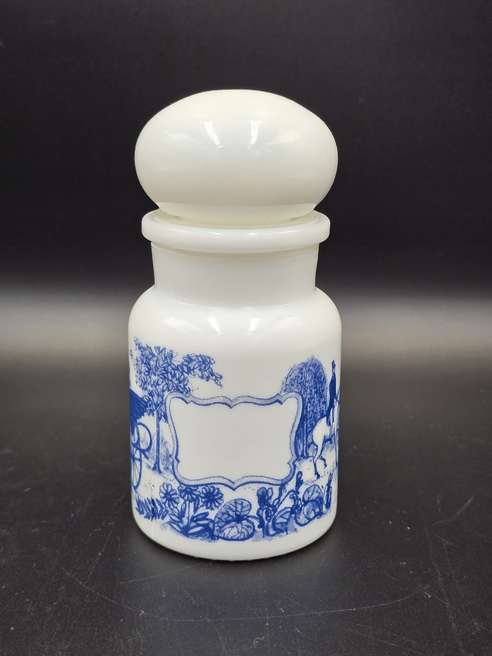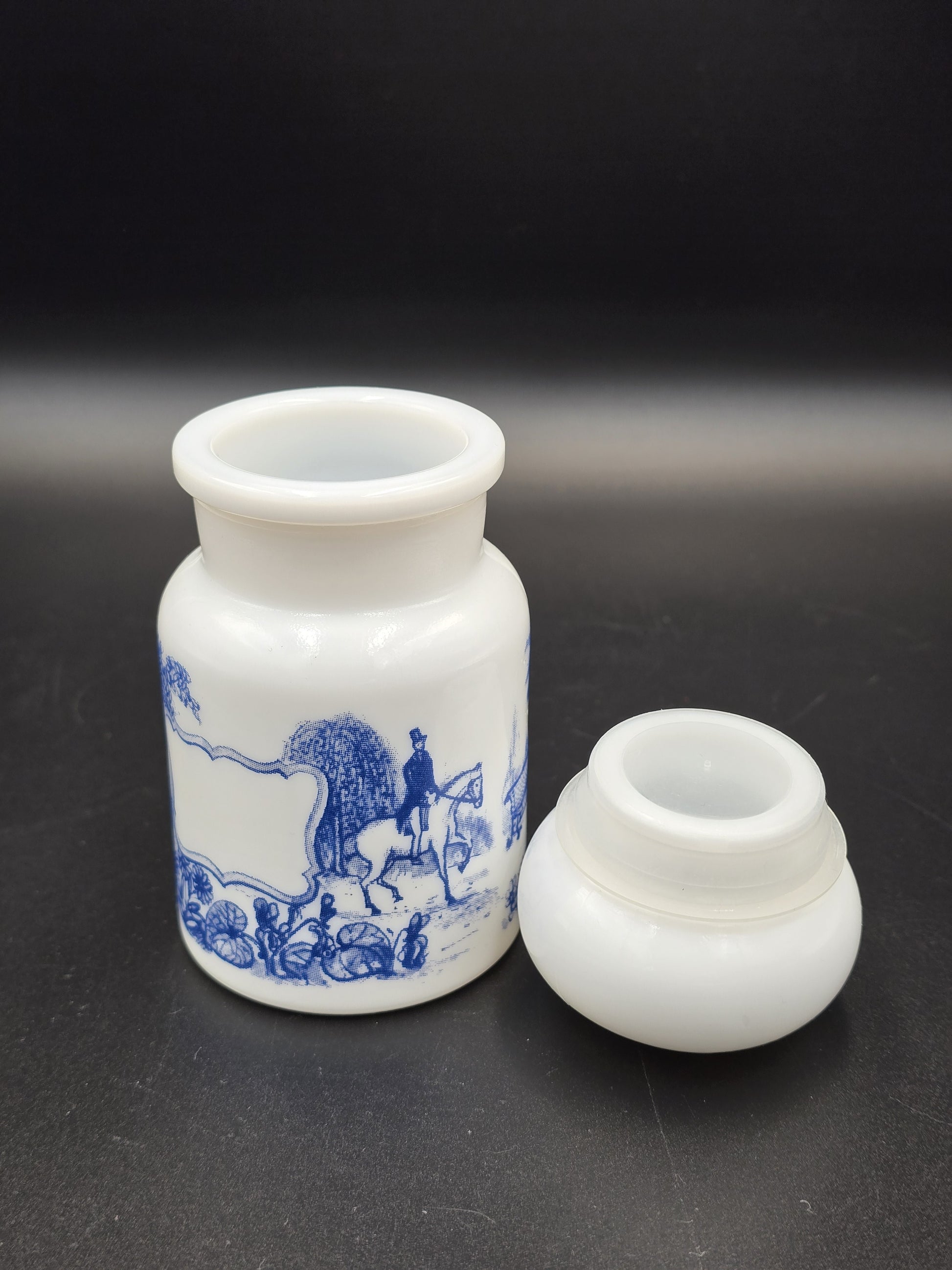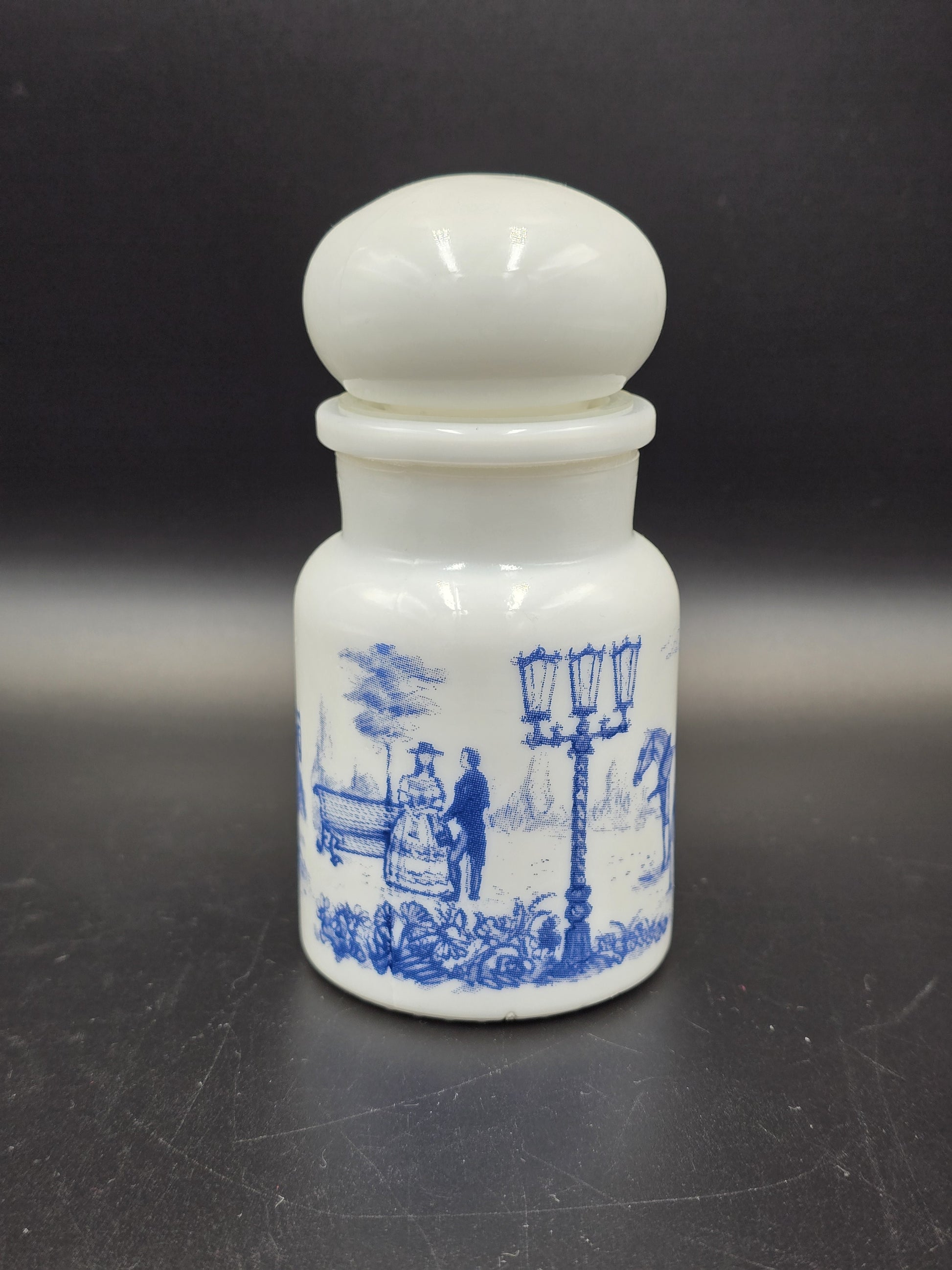Vintažinis belgiškas pieno stiklo indas su kamšteliu. Aplink indelį stebime Viktorijos laikų scenas. Kamštelio plastikinė dalis yra labai geros būklės. Pats indelis defektų neturi.