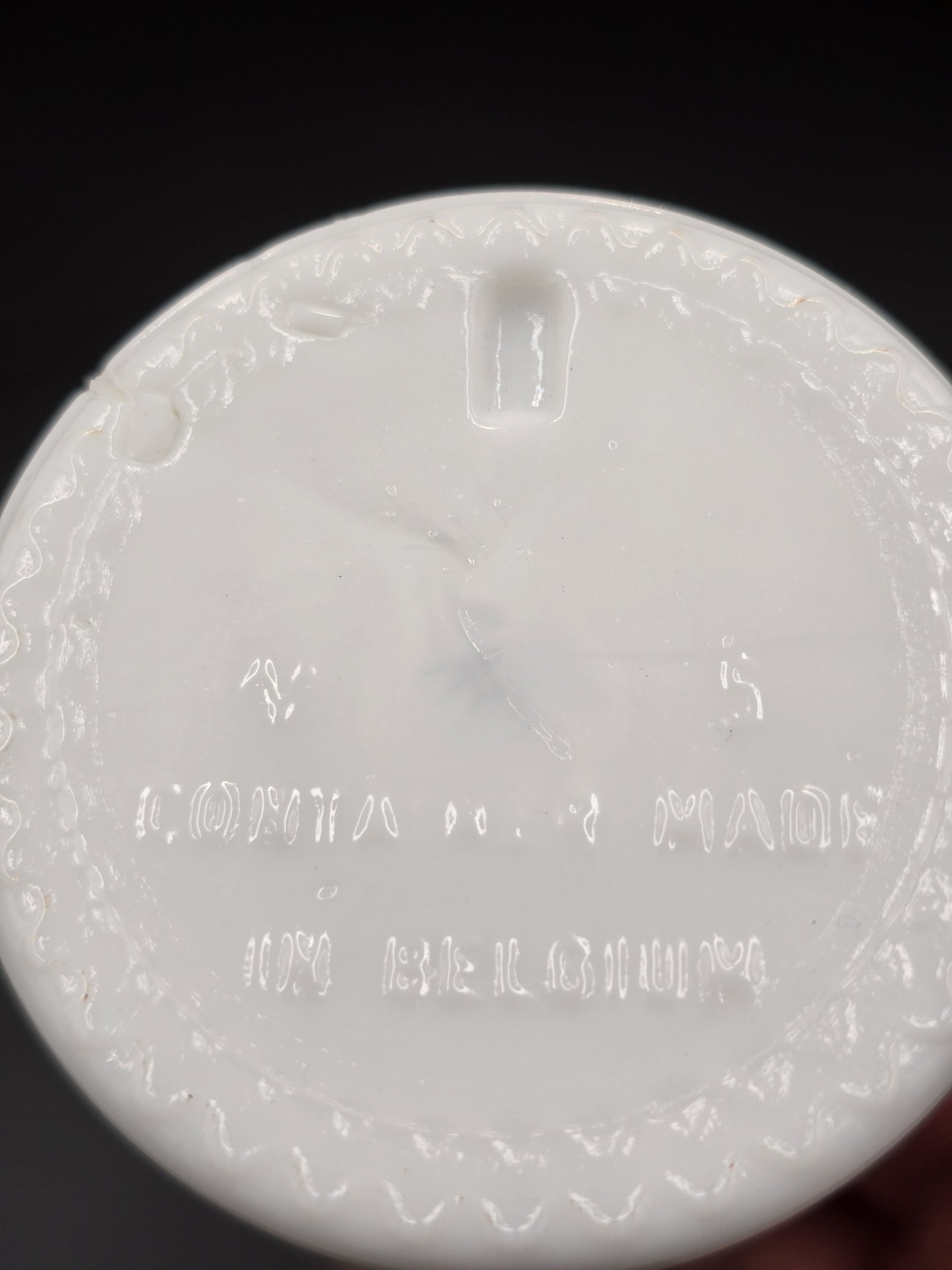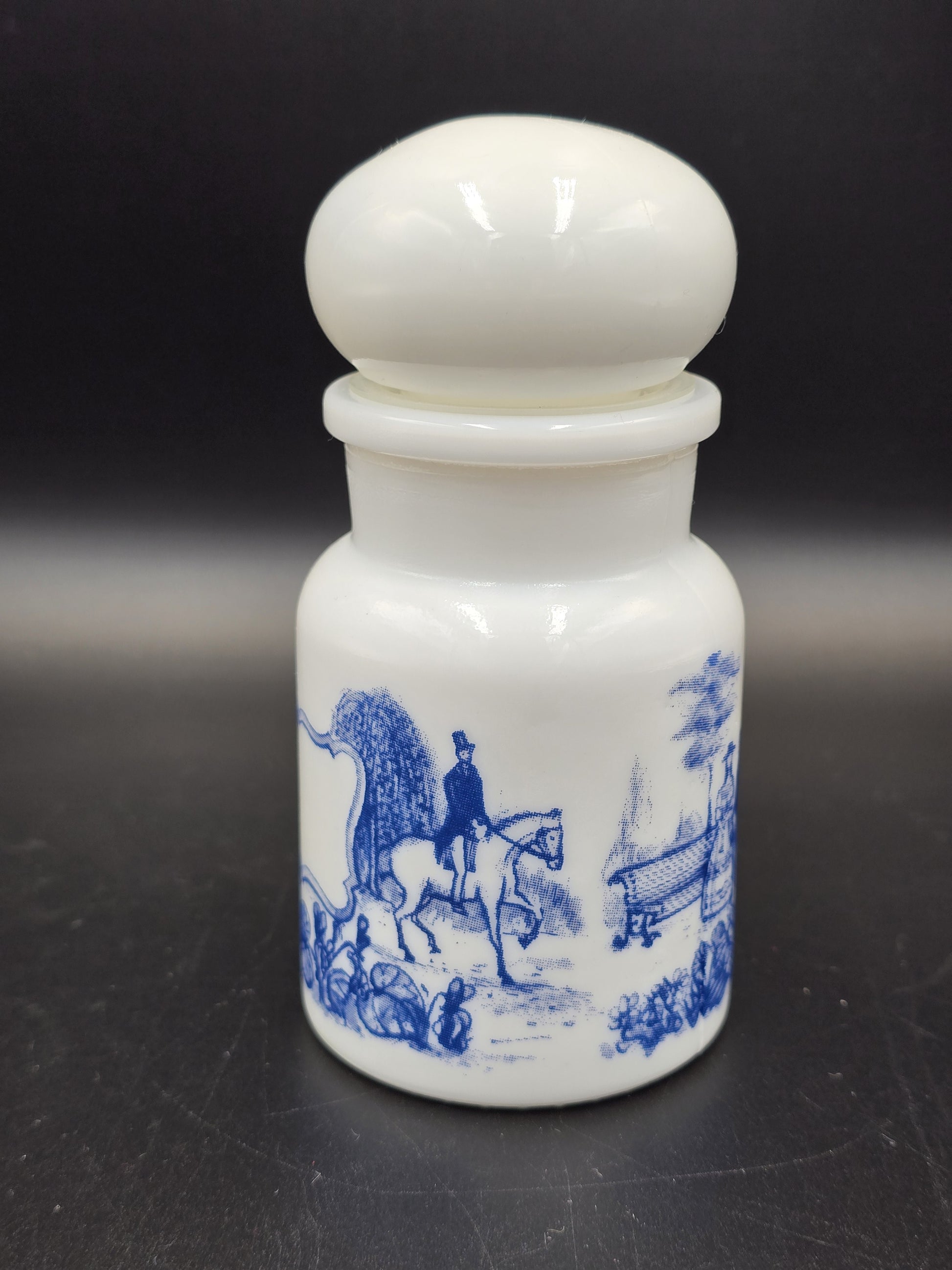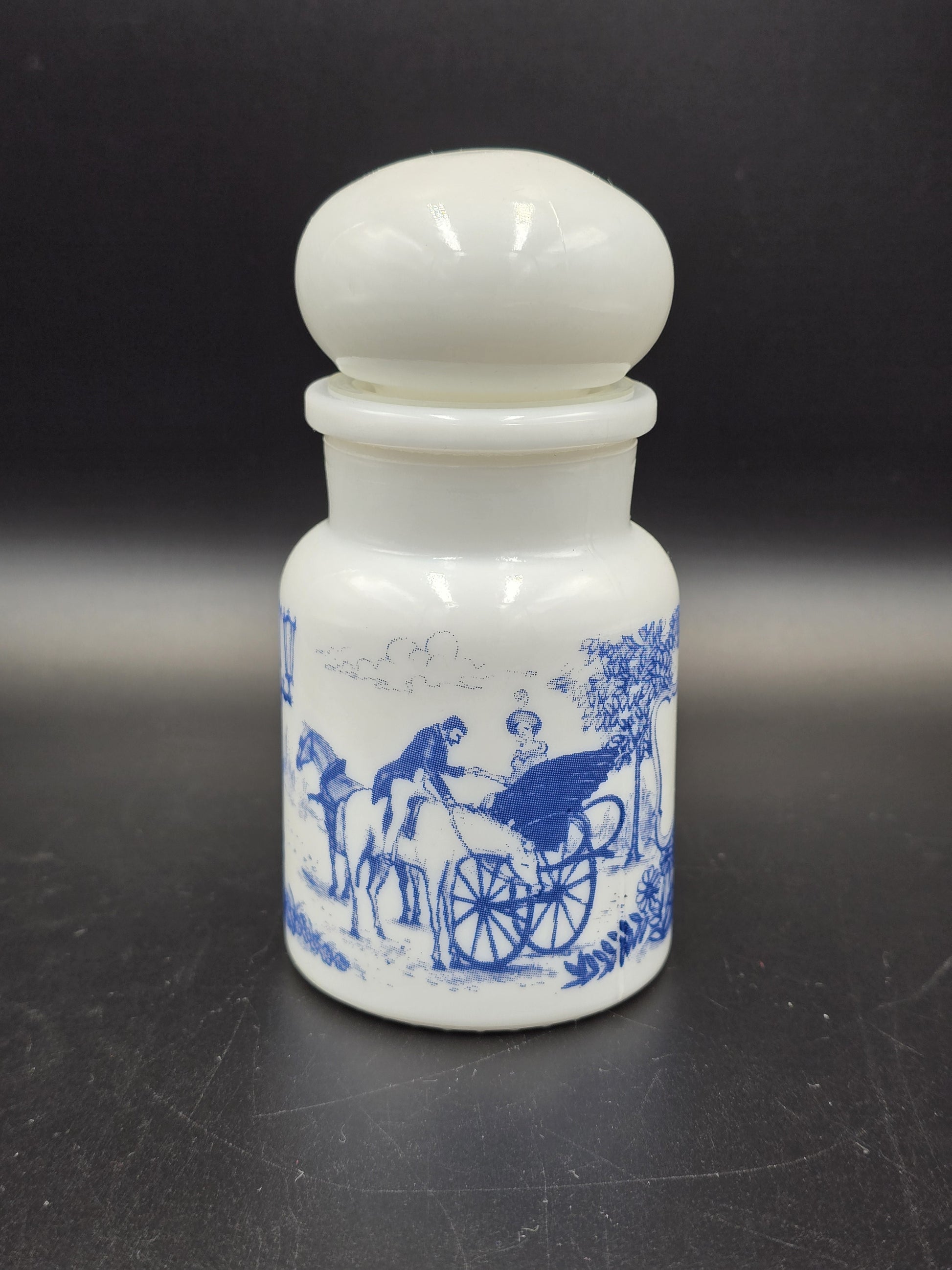 Vintažinis belgiškas pieno stiklo indas su kamšteliu. Aplink indelį stebime Viktorijos laikų scenas. Kamštelio plastikinė dalis yra labai geros būklės. Pats indelis defektų neturi.